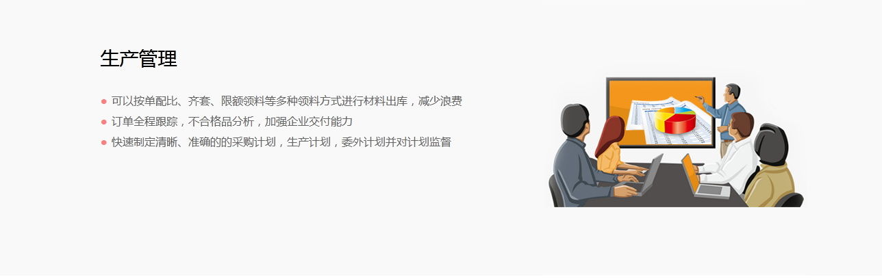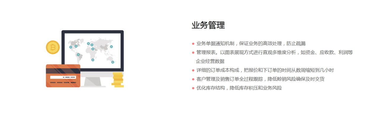 产品介绍:财务管理 信用管控●资金流向追溯、成本核算、收付款计划、财务决策分析等●用户信用额度设置,期限,信用预警●过程控制,事中控制有效减少企业坏账●事后分析,减少呆账,提高应收账款的周转业务管理●业务单据通知机制,保证业务的高效处理,防止疏漏●管理……